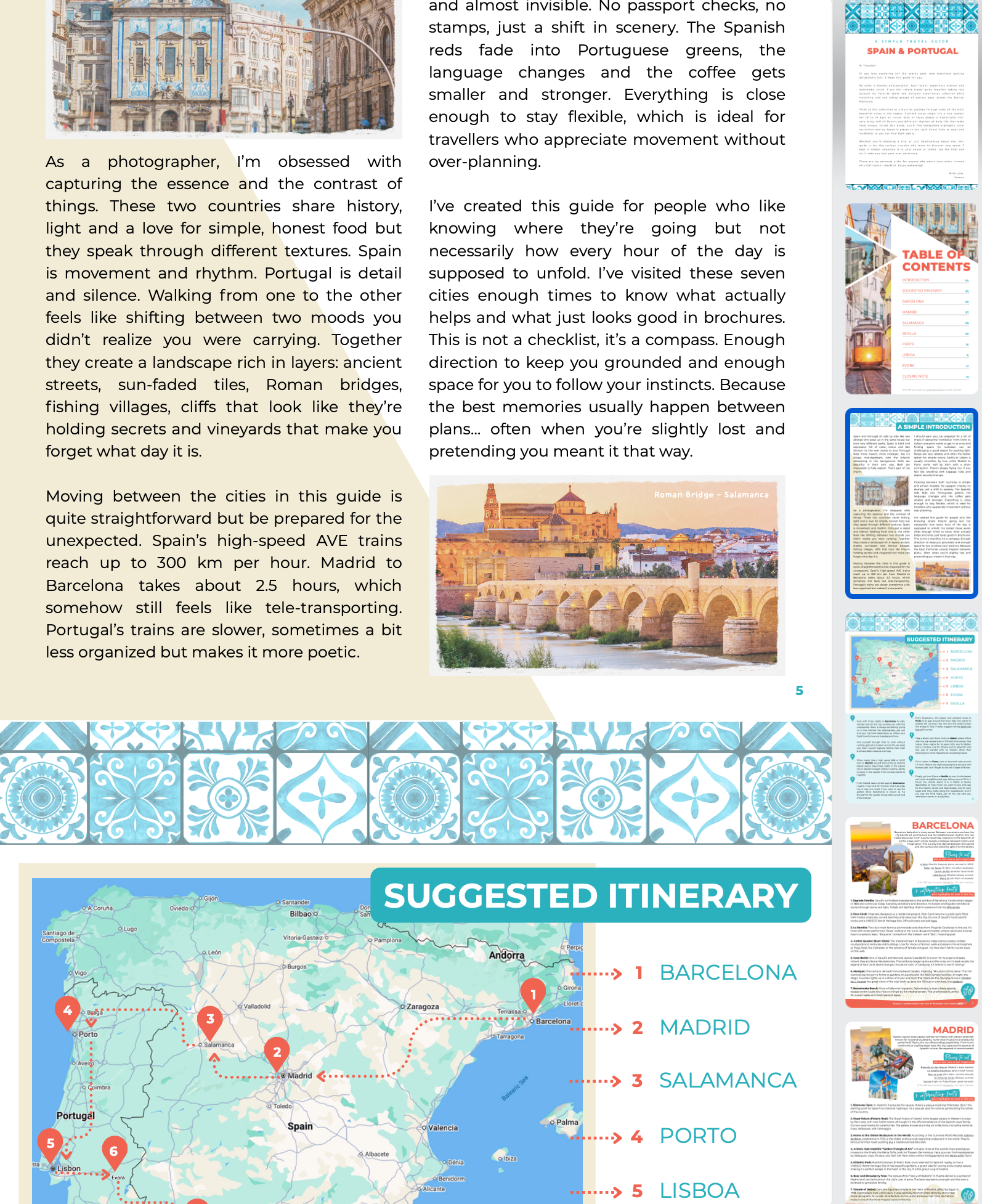 Discover Spain and Portugal with a practical travel guide made for real travelers. This digital guide covers Barcelona, Madrid, Salamanca, Porto, Lisbon, Évora and Sevilla with clear explanations, local tips and straightforward personal recommendations that don’t require over planning. Links included directly in each PDF.
